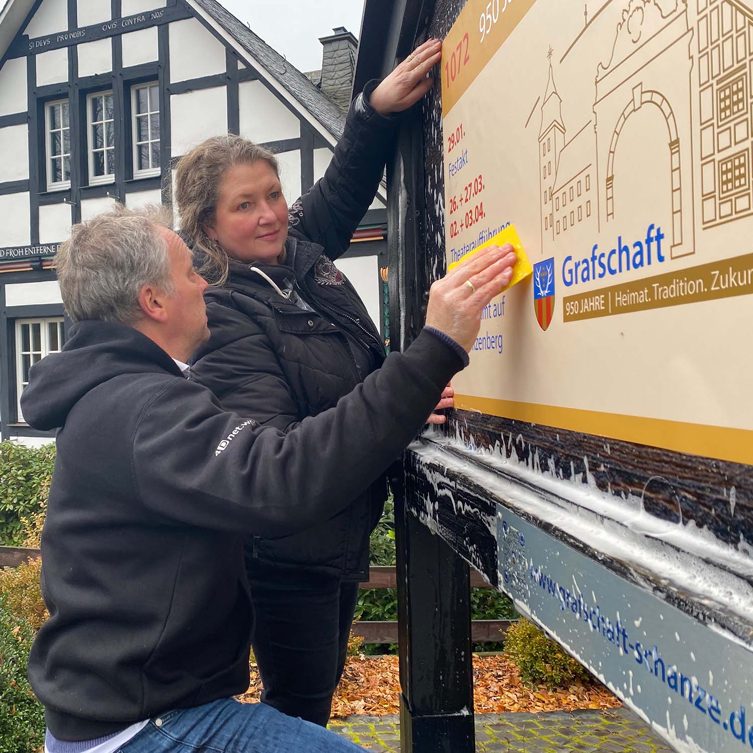 Um Dich auch draußen ins richtige Licht zu rücken, erstellen wir auch großformatige Schilder, Planen oder Leuchtschilder.