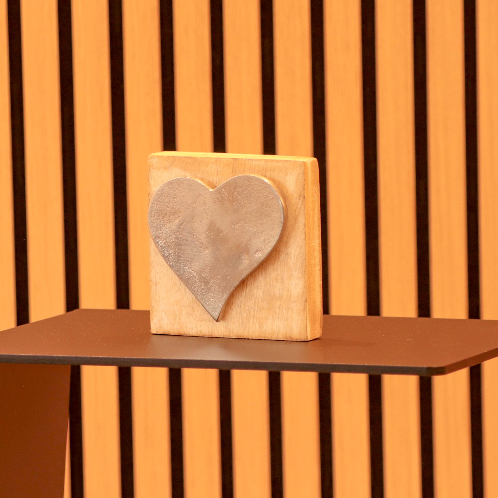 Holzplatte mit Metallherz zum Hinstellen oder Hängen. Schlichtes Design, das sich gut in verschiedene Wohnumgebungen einfügt.