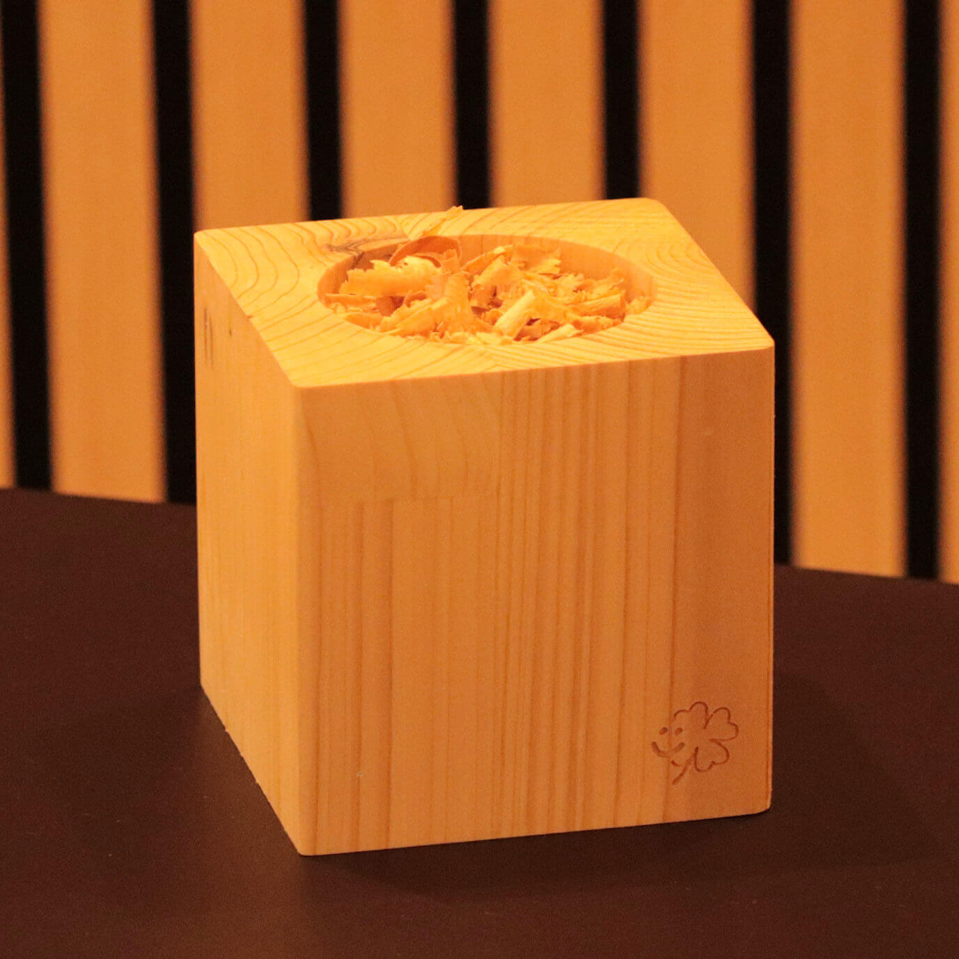 Kubus aus Holz mit Zirbenspänen. Die Späne können mit natürlichen Duftölen beträufelt werden.