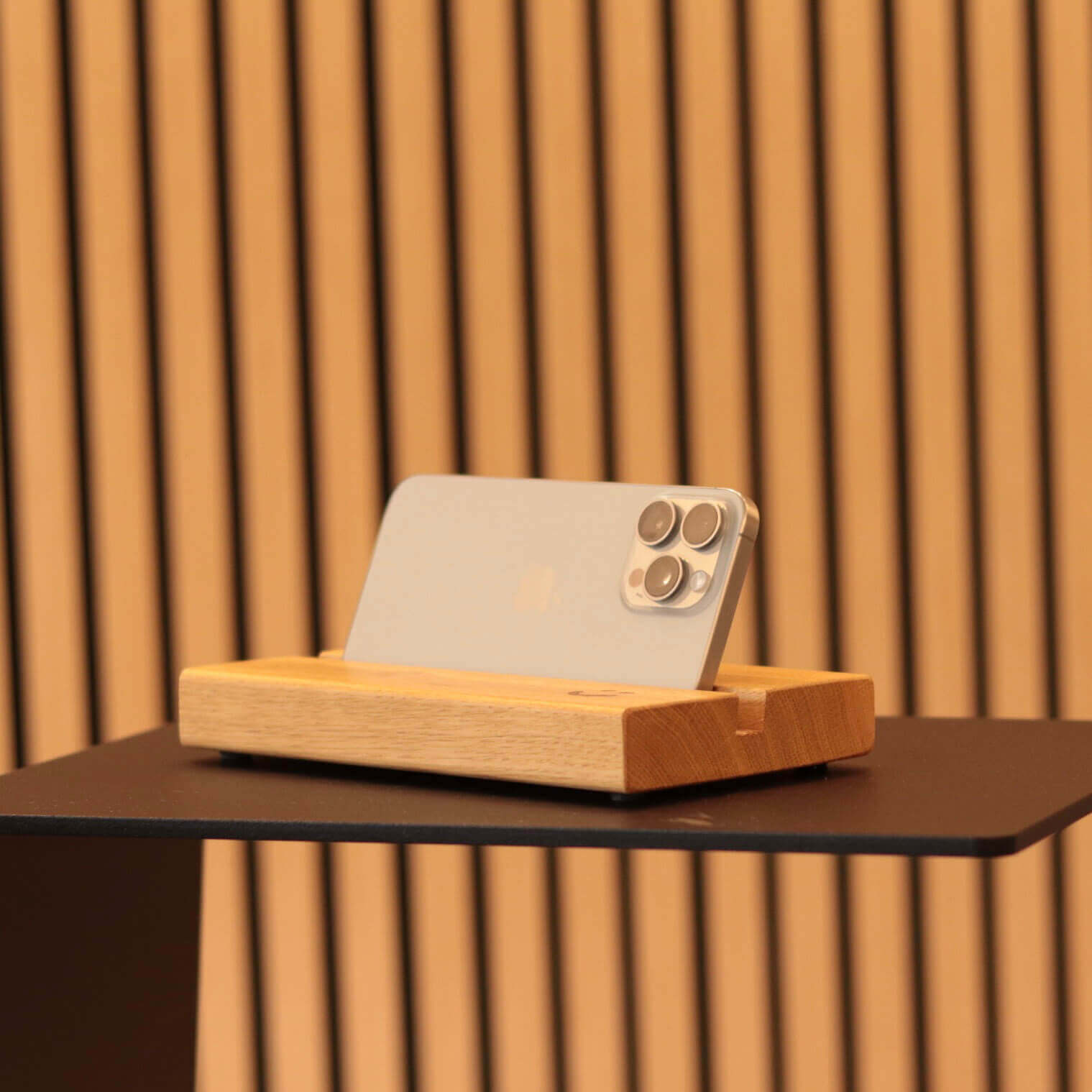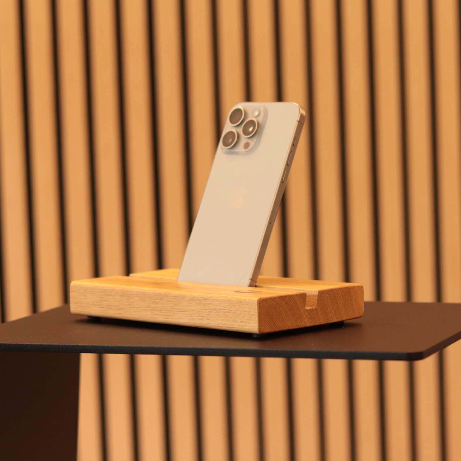 Schlichte Handybank aus Holz, ideal zur sicheren Ablage von Smartphones. Kompaktes Design mit den Maßen 20 × 11,5 × 3 cm (L × B × H) passt in verschiedene Umgebungen wie Büro, Wohnzimmer oder Küche.